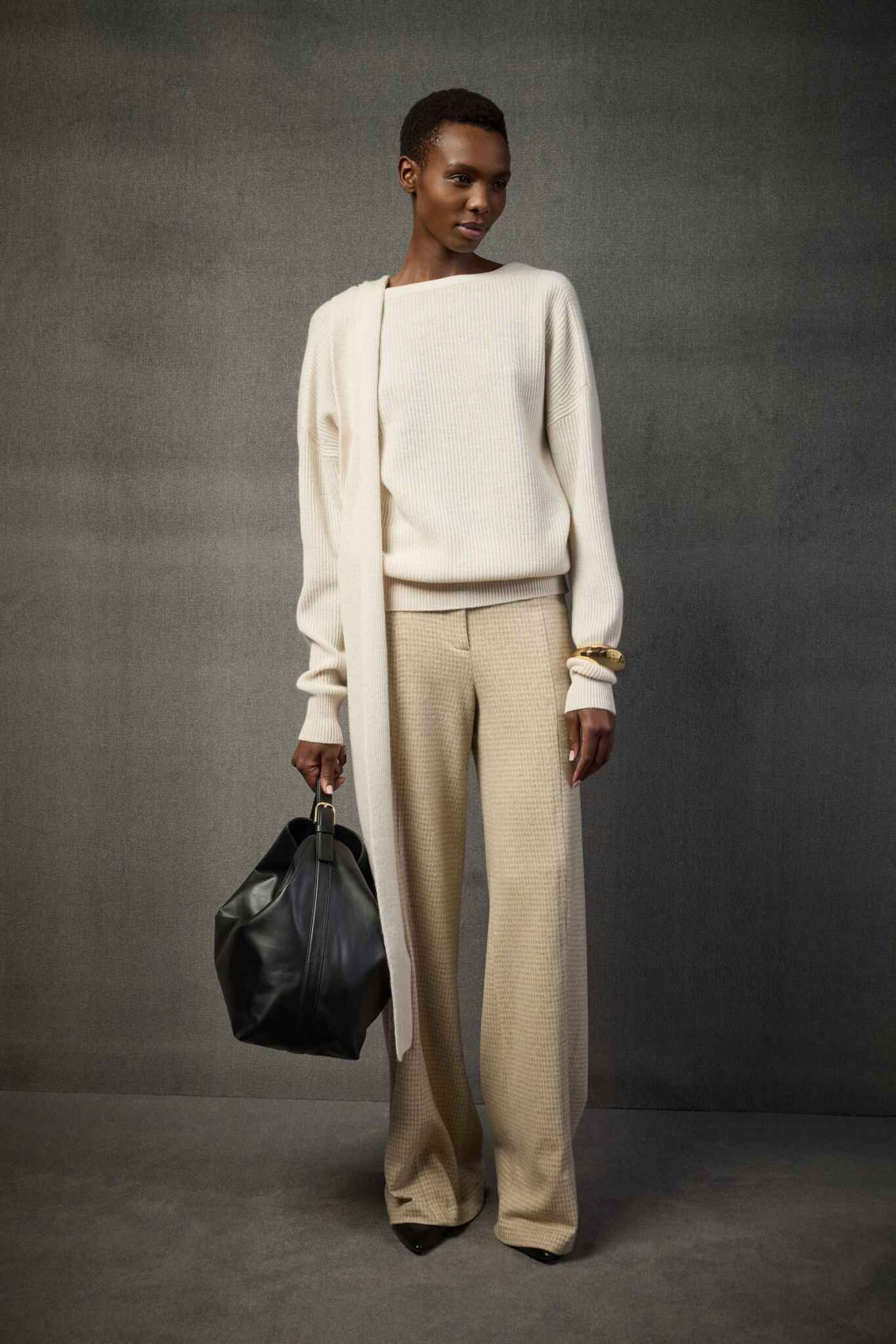 PULL EN LAINE ET CACHEMIRE AU DESIGN ASYMÉTRIQUE AVEC MANCHES LONGUES, PARTIE SUPÉRIEURE LARGE À EFFET ÉCHARPE, ENCOLURE EN V, BOUTONNAGE SUR LE DEVANT ET COUPE COURTE DANS LA PARTIE INFÉRIEURE.