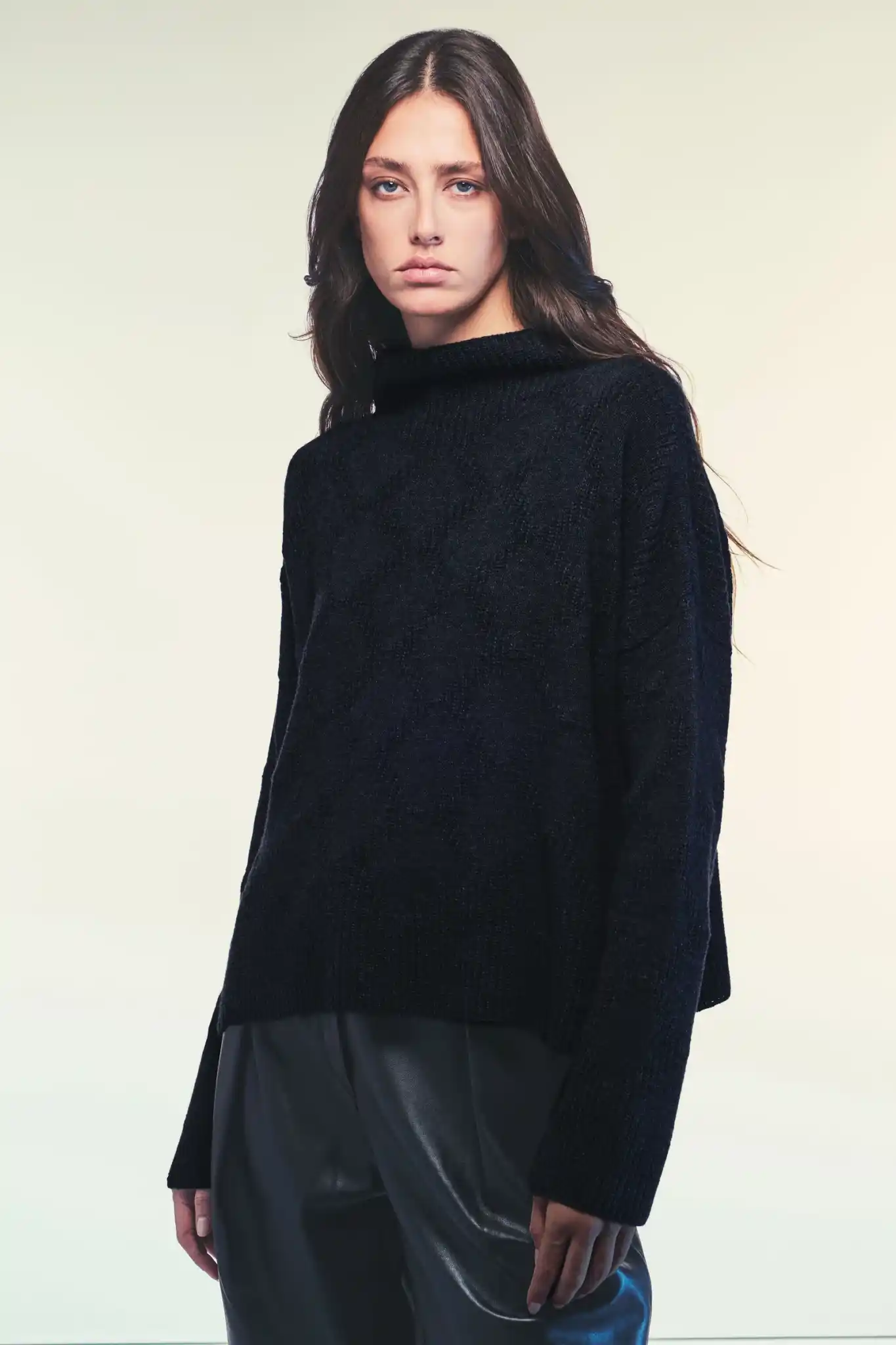 PULL À COL ROULE EN CACHEMIRE RECYCLÉ AVEC MOTIF ROMAIN TON SUR TON. ÉPAULES TOMBANTES, COL, POIGNETS ET BAS HAUTS ET ÉLASTIQUES. LONGUEUR AU BAS, COUPE DÉCONTRACTÉE. 50% CACHEMIRE 50% POLYAMIDE